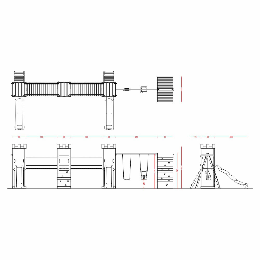 Struttura a n.3 torri Deluxe con n.2 ponti di collegamento + n.2 scivoli + altalena con n.1 sedile libero + n.1 sedile a gabbia + sartia climbing