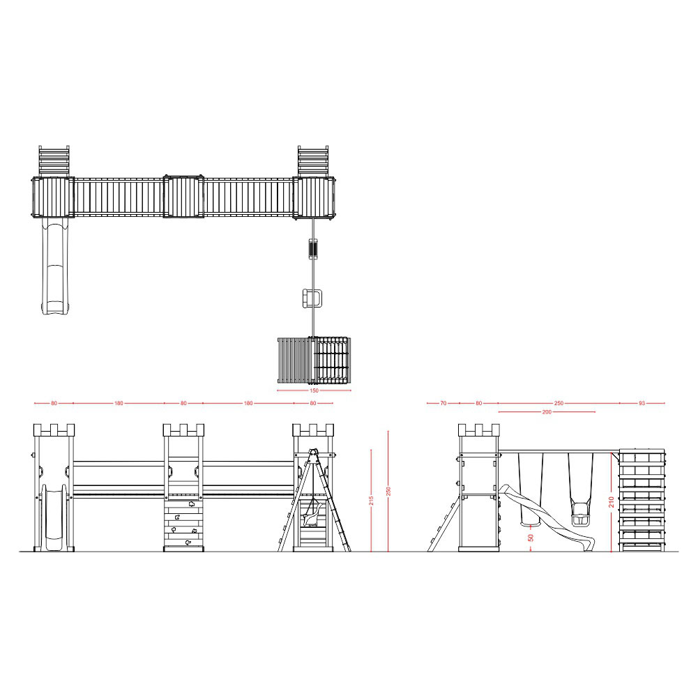 Struttura a n.3 torri Deluxe disposizione angolare con n.2 ponti di collegamento + n.1 scivolo+ altalena con n.1 sedile libero + n.1 sedile a gabbia + sartia
