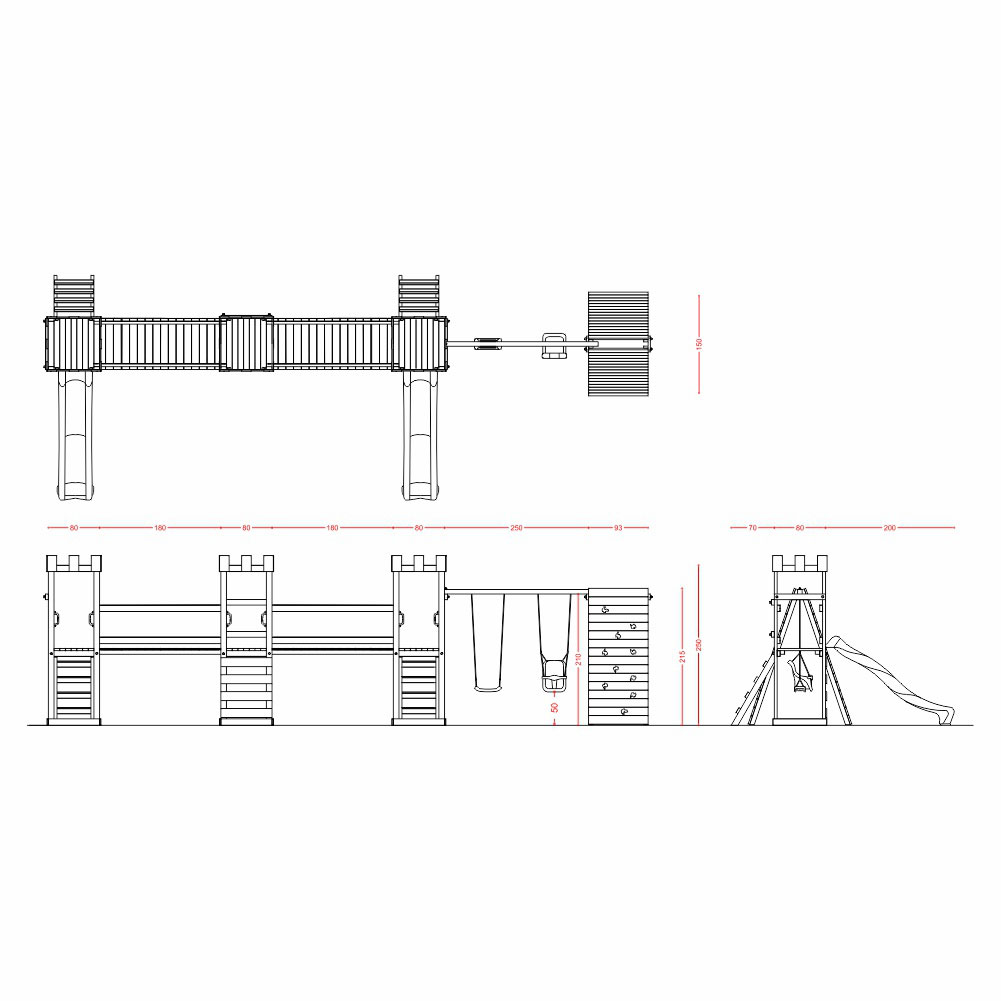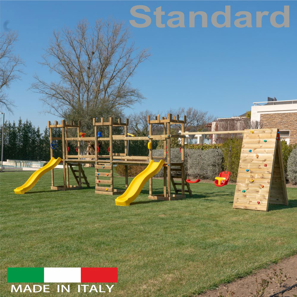Struttura a n.3 torri Standard con n.2 ponti di collegamento + n.2 scivoli + altalena con n.1 sedile libero + n.1 sedile a gabbia + sartia climbing