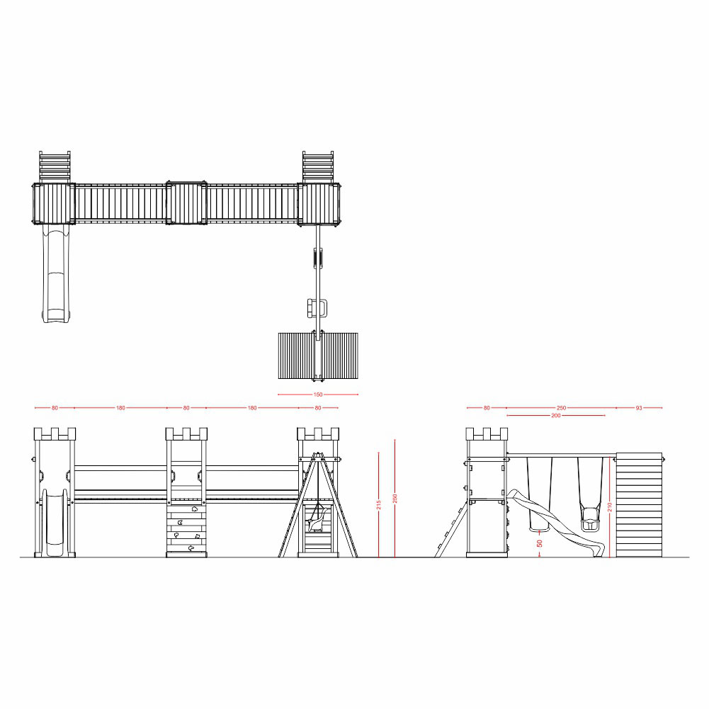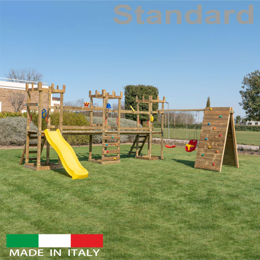 - N.1 altalena con trave in legno di pino nordico impregnato in autoclave secondo le norme DIN 68800 completa di n.1 sedile libero + n.1 sedile a gabbia;