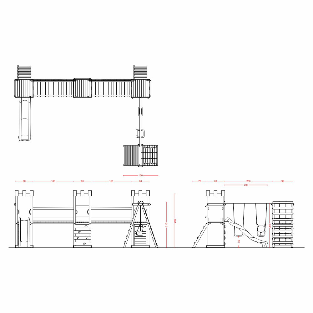 Struttura a n.3 torri Standard disposizione angolare con n.2 ponti di collegamento + n.1 scivolo + altalena con n.1 sedile libero + n.1 sedile a gabbia + sartia