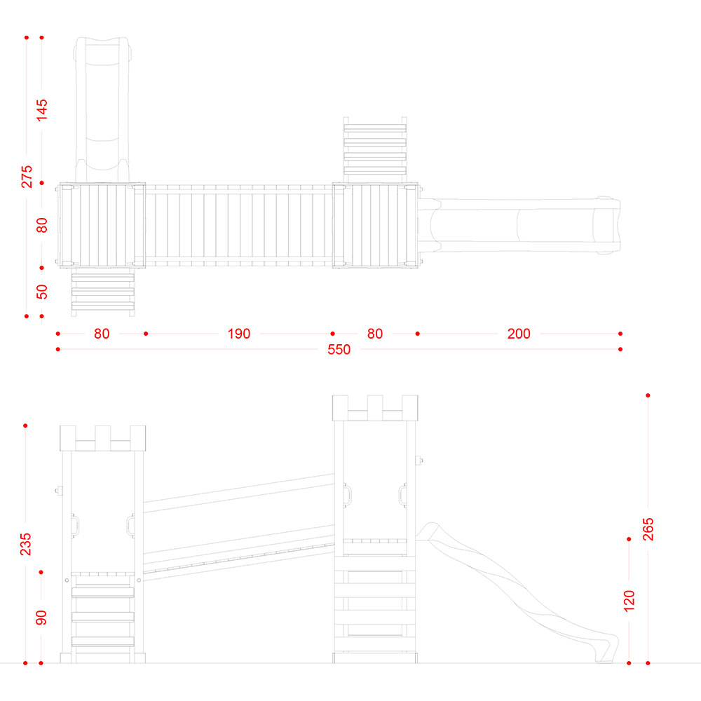 - N.2 tetti realizzati in pino nordico impregnato secondo le norme 68800, elementi di decoro in HDPE-ANTI UV COLORE ROSSO