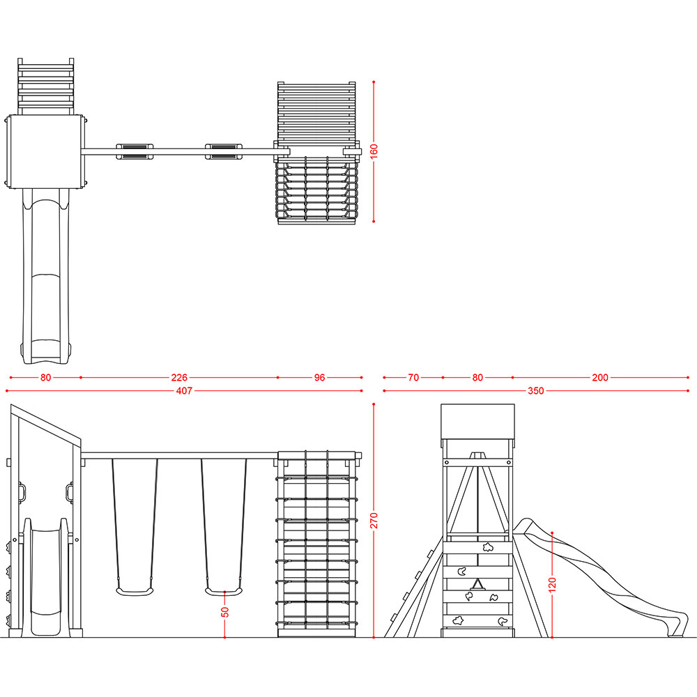 • N.1 arrampicata composto da 4 elementi se. 45x140mm, in pino nordico impregnato in autoclave secondo le norme DIN 68800 e falde in robusto telo;